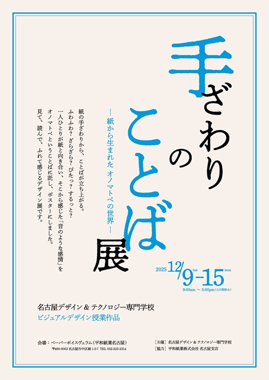 一人ひとりが紙と向き合い、そこから感じた"音のような感情"をオノマトペということばに託し、ポスターにしました。見て、読んで、ふれて感じるデザイン展です。ぜひご来場ください。