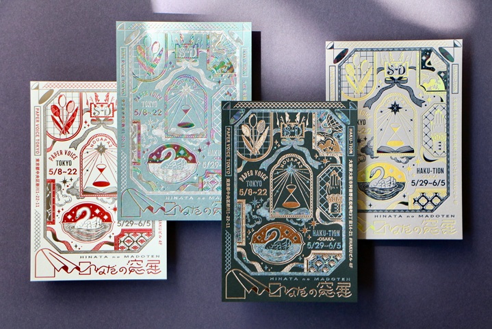 本展では、今年の春に発行したデザインまとめ本「脳内アパルトマン2~日なたの窓編~」のカバー展示を中心に、これまで制作させていただいた名刺や栞、カード類も展示いたします。紙と箔、そしてデザインが組み合わさることで生まれる無数の可能性を是非ご覧ください。